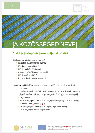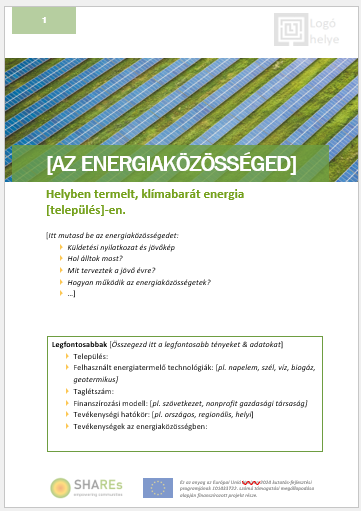 - bemutat egy koncepciót arra vonatkozóan, hogyan kell felépíteni egy meggyőző tájékoztató anyagot/brosúrát, például egy energiaközösség vagy energia akciócsoport esetében a polgármester meggyőzésére, új befektetők bevonására, a közösség bemutatására a helyi sajtónak, és